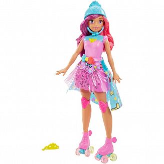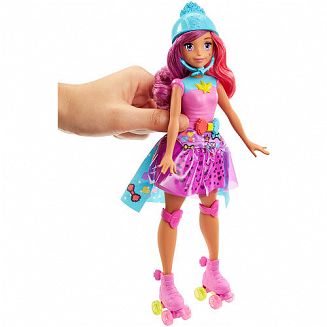 W stroju tej inspirowanej filmem „Barbie w świecie gier” lalki na wrotkach została ukryta gra pamięciowa! Różowa spódniczka lalki wyświetla światełka według wzoru. Odtwórz wzór za pomocą kolorowych guzików przy pasie lalki. Im więcej wzorów odgadniesz, tym trudniejszy będzie następny. 5 poziomów gry zapewni emocjonującą zabawę i wytrenuje pamięć młodych graczek. Księżniczka ma wrotki z ruchomymi kółkami, różowy gorset, spódniczkę ze światełkami, niebieską pelerynkę z ikonkami i ochraniacze na kolana oraz tiarę i kask. W zestawie lalka Księżniczka z grą pamięciową, wrotkami, kask i tiara. Lalka nie stoi i nie porusza się samodzielnie.