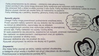 W skład zestawu wchodzą: farby (5 kolorów:czerwony, żółty, niebieski, biały i czarny), pędzelek, gąbeczka i wacik.