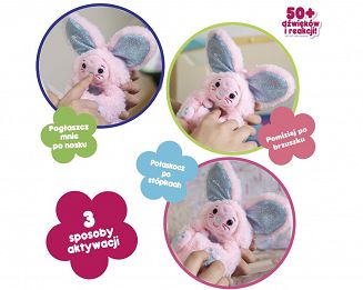 - Interaktywne reakcje – króliczek wydaje zabawne dźwięki i reaguje na dotyk oraz ruch, co sprawia, że zabawa jest pełna niespodzianek.