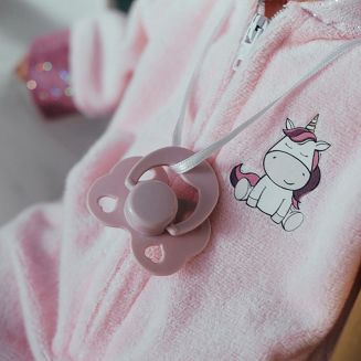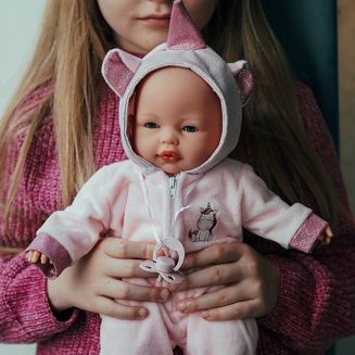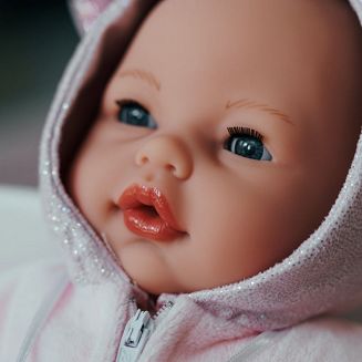 - Interaktywne funkcje – po wyjęciu smoczka lalka płacze i mówi „mama”, „papa”; po ponownym włożeniu smoczka uspokaja się.