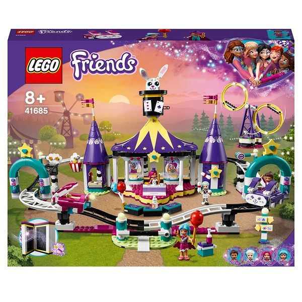 Zestaw Magiczne wesołe miasteczko z kolejką górską przeniesie wasze pociechy w niesamowity świat magi i parku rozrywki. Opakowanie zawiera 974 elementów 4 minfigurki w tym; namiot cyrkowy, kolejka górska, fotobudka, oraz wahadłowa huśtawka. Dodatkową niespodzianką są klocki, które świecące w ciemności.