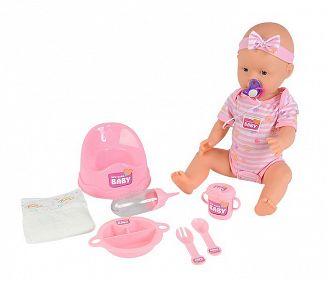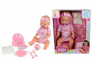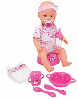 Duża lalka od New Born Baby naprawdę potrafi pić i siusiać! Uroczy bobas zachwyci Cię swym urokiem! Zatroszcz się o nią, nakarm, przewiń, posadź na nocniczku! Wszystko, czego potrzebujesz znajduje się w zestawie: nocniczek, pieluszka, talerzyk z widelczykiem i łyżką, smoczek oraz butelka, maleństwo ubrane jest w białą piżamkę z naszywką New Born Baby w motyw misiów i serduszek. Na główce ma różową opaskę z uroczą kokardką. Lalka jest wodoodporna, dzięki czemu można ją wykąpać! Dziewczynka będzie mogła poczuć się jak prawdziwa mama. Spędź niesamowity czas, tyle możliwość dzięki temu bobasowi! Wygląda i zachowuje się jak prawdziwe dziecko. Zestaw zawiera 43 centymetrową lalkę, ubranko oraz 8 akcesorii. Doskonale nadaje się dla dziewczynek powyżej 3 roku życia.